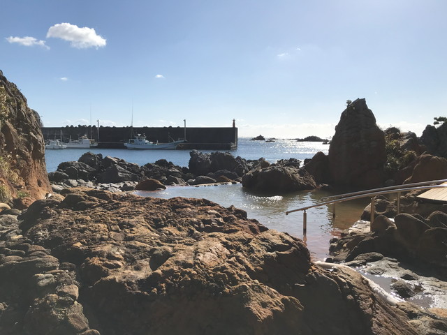 足元からブクブク湧いてきているのは見えますが、湯量が海水に負けているようでした。真夏には良さそうだな。一番手前で足湯スタート。