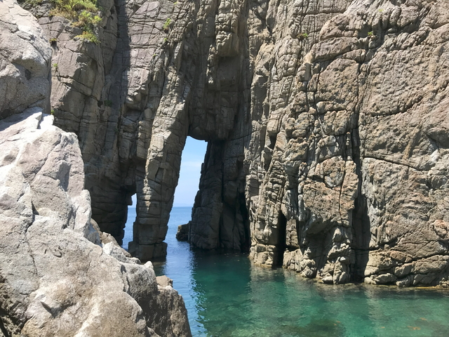 「大門(おおもん)小門(こもん)」です。国の名勝【若狭蘇洞門】に選ばれています。 今回の蘇洞門めぐり遊覧船では、小浜湾から若狭湾に入って、大門小門で上陸して出発地点に戻る内容になっています。 |