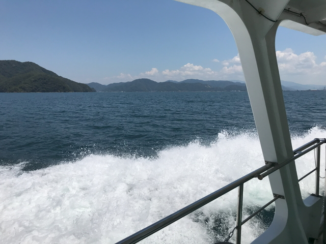 船内のエアコン性能がイマイチだったので船外で風を浴びる方が断然涼しいです。 あの岩より手前が小浜湾、外側が若狭湾と案内がありました。 |