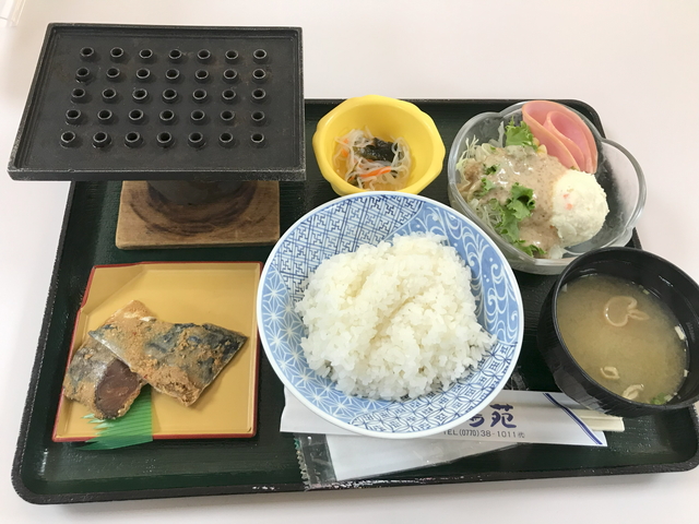 食堂で昼食にします。さばのへしこ定食がありました。 |