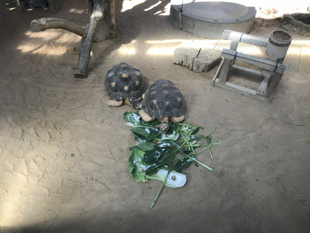 朝一訪問なのか夏休みの終わった平日だからなのかガラガラで動物たちも朝食中でした。 ホウシャガメと案内のあるリクガメの一種です。 |