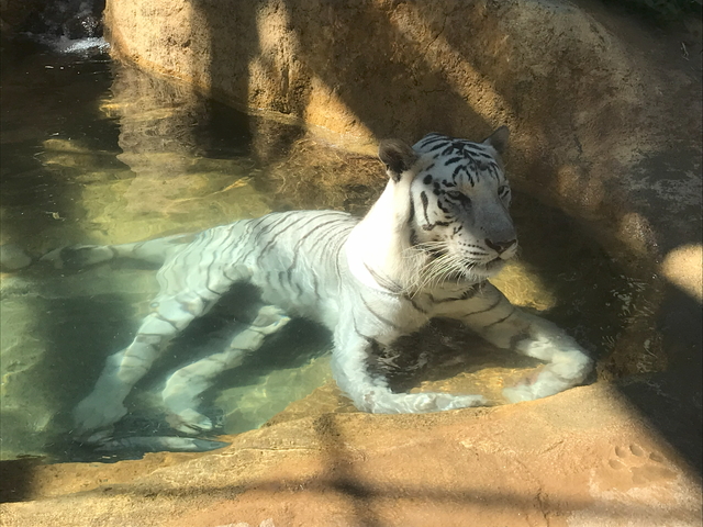 ホワイトタイガーさんです。 結構のんびり水浴びを楽しんでる感じです。急に起き上がって厩舎に駆け込んでいきました。 |