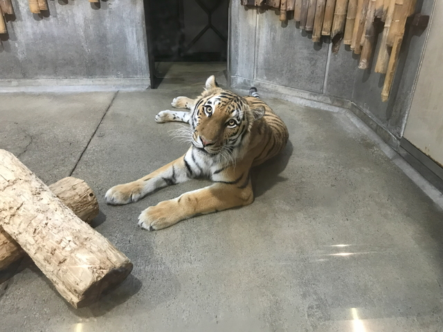 目線を一切逸らさないトラさん。 同じ「ネコたちの谷」と名付けられたエリアにユキヒョウさんがいて、メダルの被写体になった子はユキヒョウさんでした。けど写真がブレブレになっていましたので割愛です。 |