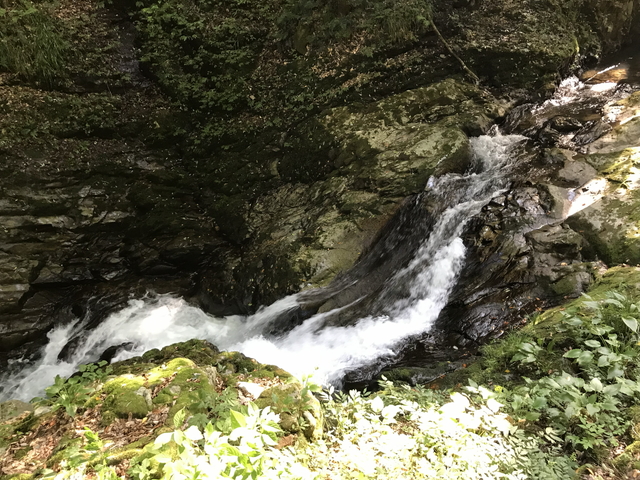 手前が八塩滝(二の滝)、奥が八汐滝(一の滝)です。両方とも「やしおだき」と読むみたいです。 八塩滝の左手に鉄鎖があり、登れるようになっていますが、3連休初日なので無理はしないでおきました。全体として三重県の赤目四十八滝のスケールを小振りにした感じです。 |