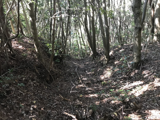 堀跡と思われる凹です。 白鹿城は、尼子十旗と呼ばれる尼子氏の支城群の中でも第一とされる堅城だったと伝わります。 |