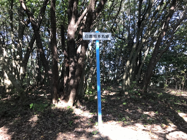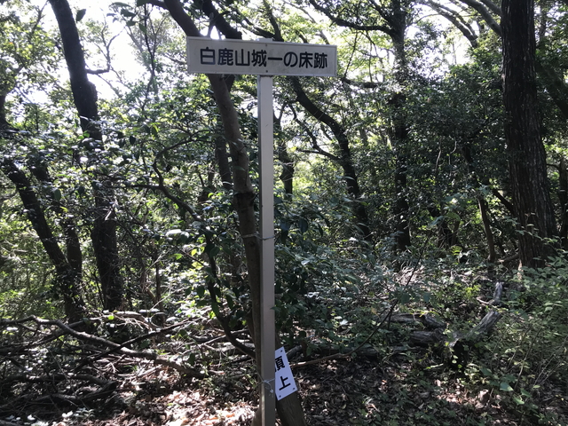 少し戻って白鹿山の山頂地点も訪問しておきます。 山頂地点は、曲輪が形成されており「一の床」と案内されています。「一の床」の先に「二の床」「三の床」と名付けられた曲輪が連続しており、普通に考えたらこの「一の床」が本丸で、先ほどの本丸跡地の案内があった曲輪は本丸北側を守る曲輪と感じます。 |