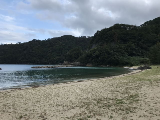 道路を挟んで砂浜が広がっており、布施集落の海水浴場となっています。 |