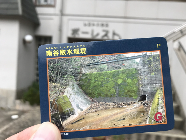 春日神社の近くにあるレストハウス ポーレストさんで、南谷取水堰堤のダムカードを頂きます。 予定外のダムカードですが、目的地の日本の白砂青松100選【春日の松群】とほぼ同じポイントだったので助かりました。 |