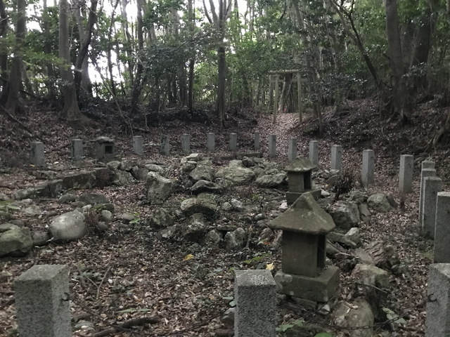 その先には石塁があり、墓地の様でもあり、石垣跡の石塁を保存しているようにも見えましたが、駐車スペースにあった「国府尾城址の説明板」には、中世墓地が遺構の一つとして案内されていたので、恐らくはこれが中世墓地として保存されているのだと思います。 ここから先が尾根沿いを少し歩いてから一気に急峻な登りになります。ロープが設置されている親切設計ではあります。 |