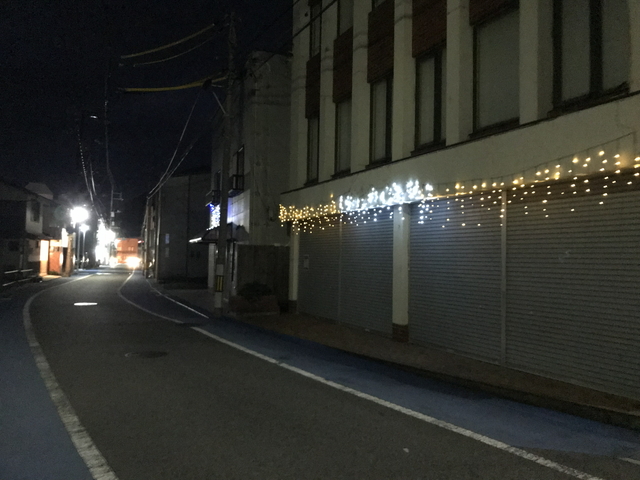 汗を流してからホテルの周辺チェックです。 さすがは隠岐の島、18時過ぎで真っ暗です。イルミネーションが逆に寂しげです。 |