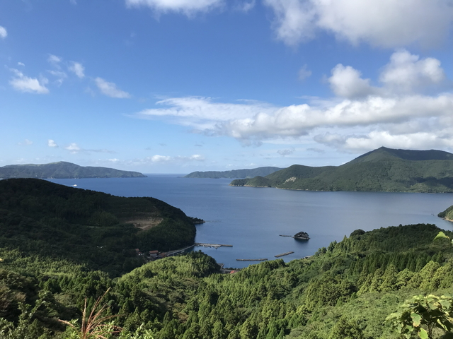 西ノ島、中ノ島、知夫里島の3島は、外輪山の名残と考えられています。右の島が西ノ島で手前に見えている山が焼火山です。左の島が知夫里島です。 天気に恵まれたおかげでとても満足のいく景観を楽しめました。 |