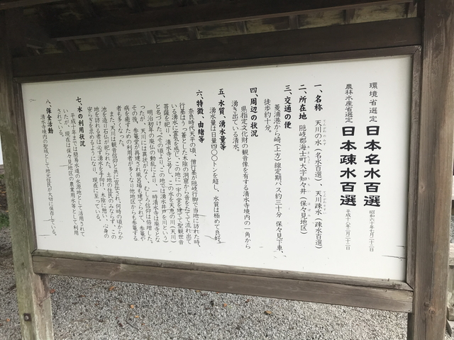 天川の水は、奈良時代に、行基がこの地を訪れた際に、この湧水を天川(天恵の水)と名付けたと伝承があります。近くに聖観世音菩薩を祀り、清水寺と名付けたそうな。 | |