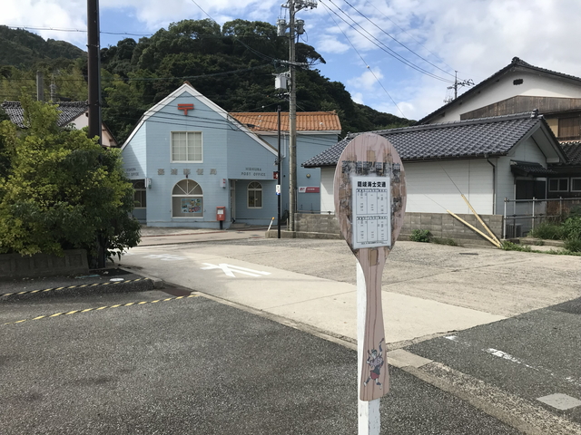 しゃもじ型のバス停と洋風な郵便局の一枚です。妻が風景印を欲しがっていますが本日は祝日です。 |