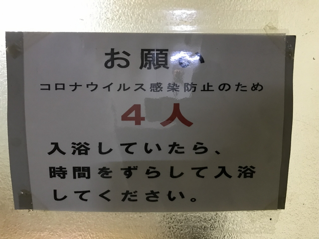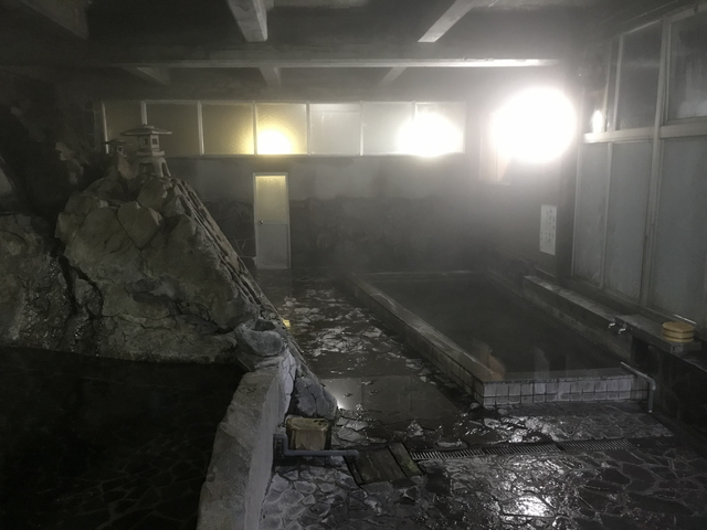 右が加温された温泉です。透明なアルカリ性単純泉で、ちょいヌメな感じです。 まぁ4人で満員だな。洗い場は3セットあります。 |