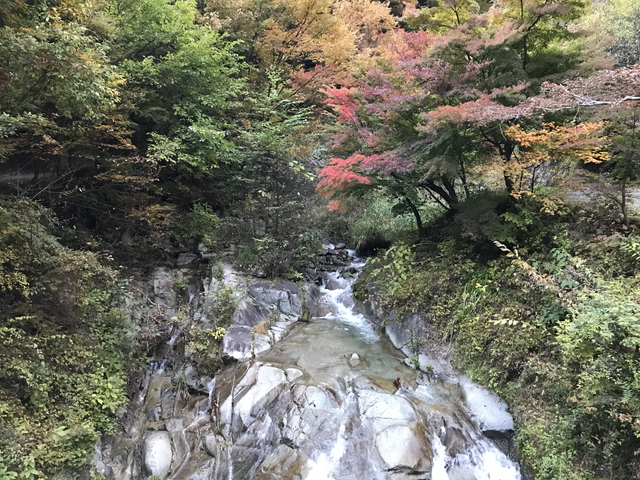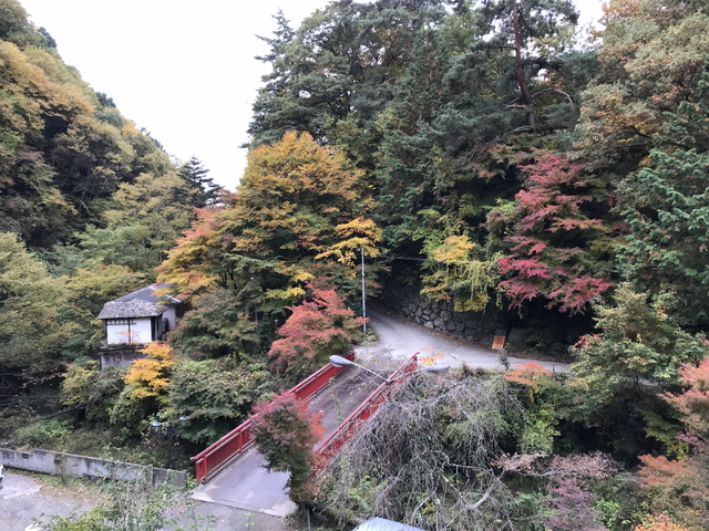 翌朝です。 旅館前の橋の上からの一枚です。旅館の横を渓流が流れており、水量もそこそこあるので、ずっとせせらぎが聞こえます。 |