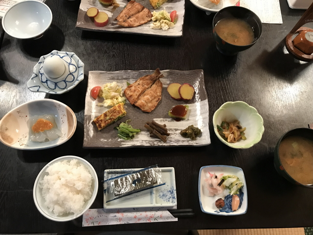 朝食です。 とても健康な感じです。ノリは味のないノリだけど、納豆は出てこない関東よりだけど、関東じゃない朝食です。ご馳走様です。 |