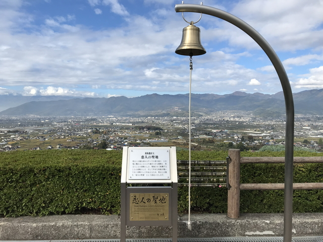 恋人の聖地【甲州市勝沼 ぶどうの丘】の顕彰碑は展望フロアに設置されています。 周辺はぶどう畑に囲まれており、南アルプス・甲府盆地を一望できるその眺望は一見の価値があります。 |