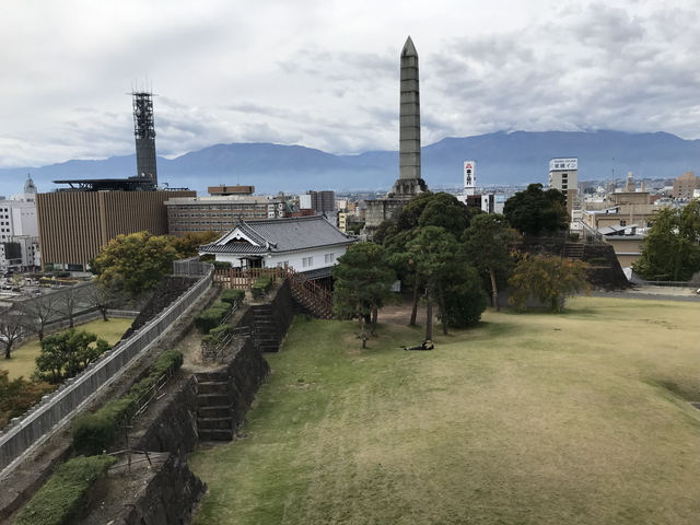 天守台から西を見た一枚です。あの塔はなんだろう? 近づいて確認すると、大正11年(西暦1922年)に建立された謝恩碑でした。 明治時代に水害に苦しめられた際に、明治天皇より御料地の下賜(かし)が行われたことに対する感謝を示す謝恩碑です。 |