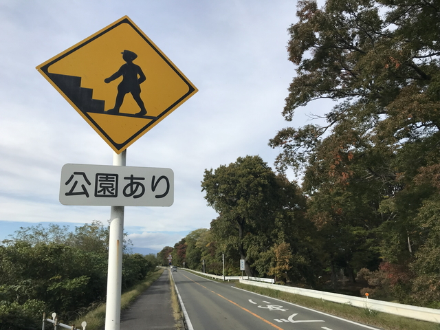 信玄堤(しんげんづつみ)です。 信玄堤は、山梨県甲斐市竜王を流れる釜無川の堤防です。現地では、信玄堤公園が整備されており、珍しい階段付きの歩行者注意標識があります。 |