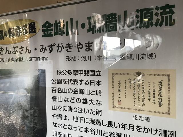 塩川ダムの上流は、本谷川渓谷(ほんたにがわけいこく)が形成されており、本谷川渓谷に沿った林道には親水スペースが整備されています。 現地では、みずがき湖ビジターセンターに、平成の名水百選【金峰山・瑞牆山源流】の認定証コピーが掲示されアピールされていました。 |
