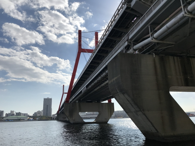 真下からの写真です。 六甲大橋は、昭和52年(西暦1977年)に供用開始した橋長400mのダブルデッキ連続トラス式斜張橋となります。完成当時、世界初とニュースになりました。 |