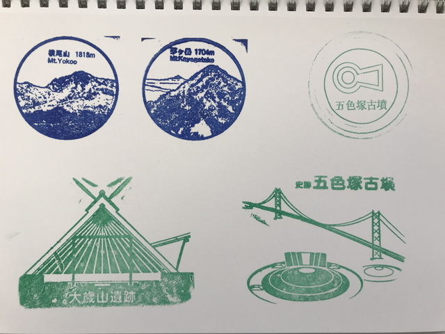 その後、撤収しました。今回の旅路での五色塚古墳のスタンプです。左上は山梨でのスタンプです。 |