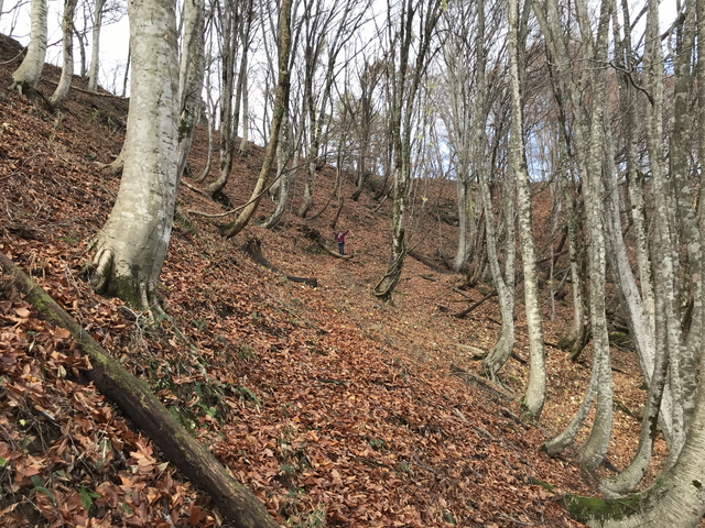 遊歩道が整備されている、という事前情報でしたが、明らかに遊歩道が崩壊しています。 扇ノ山(おうぎのせん)の南麓に広がる諸鹿川渓谷へのアクセスは、広留野高原(ひろどめのこうげん)に位置する駐車場から急降下となります。 |