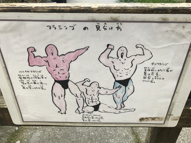 フラミンゴさんの見分け方です。3種類いるみたいで筋肉質なフラミンゴさんの絵で解説されています。 |