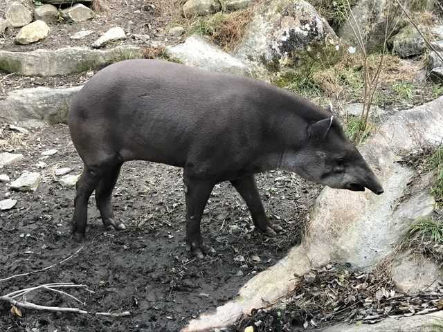 ブラジルバクさんです。 バクを飼育しているのはちょっと珍しいです。生活スペースも広めで良い待遇を受けています。生息地のアマゾンでは食用にも供されているみたいで、南米大陸におけるイノシシのような存在です。 |