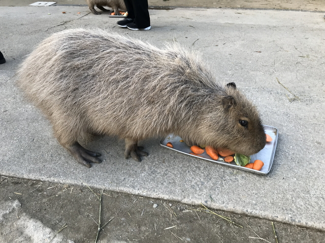 カピバラさんです。 バイオパークで一番の勝ち組待遇を受けています。カピバラさんは、世界最大のネズミです。漢字で書くと水豚なので、当初は豚の仲間だと考えられていたのかもしれませんね。 実際に触れたり、写真が撮りやすいようになっていますが、それネズミだかんな。 |