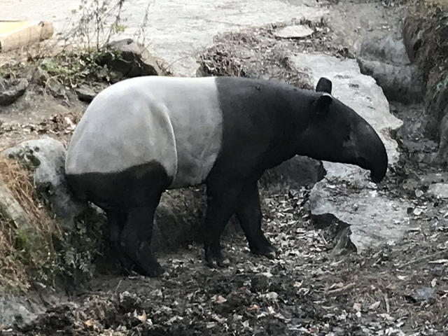 マレーバクさんです。マレーバクさんも普段見かけない動物です。白黒のツートンカラーが特徴的です。 「ツートンカラーは、夜行性のため密林でカモフラージュとなり外敵から身を守る色合い」と解説されていましたが、そんなものは人間が勝手にそうだろうなぁと想像しているだけで実際はわからないものです。 マレーバクさんは、絶滅危惧種に指定されていることから外敵から身を守れていないようですね…。 |