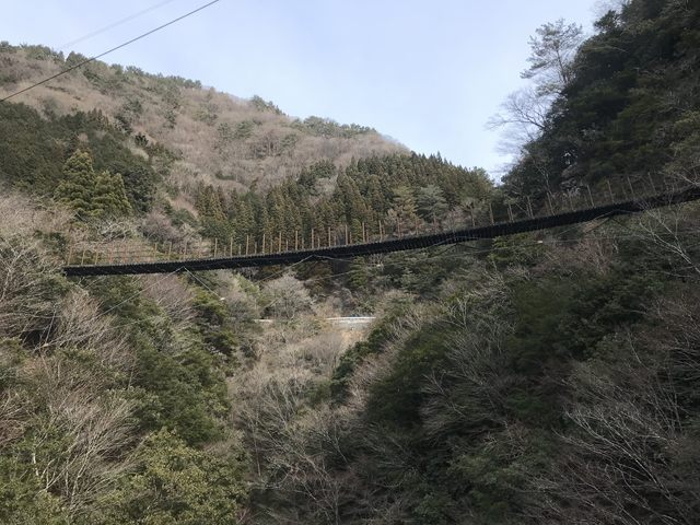 しゃくなげ橋から見たあやとり橋です。ふ〜怖かった。 |