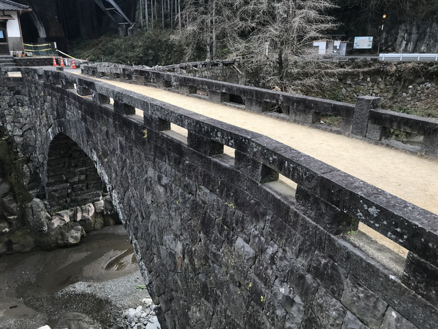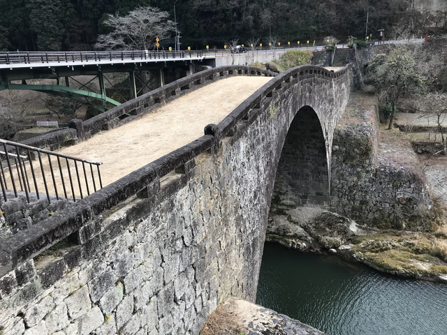 霊台橋は、明治以前に竣工した石橋として日本最大のアーチ径間を誇り、架橋時に培われた技術は、7年後に完成する通潤橋に応用されたと伝わります。 昭和41年(西暦1966年)以降、自動車の通行禁止となり、観光地として整備されています。 |