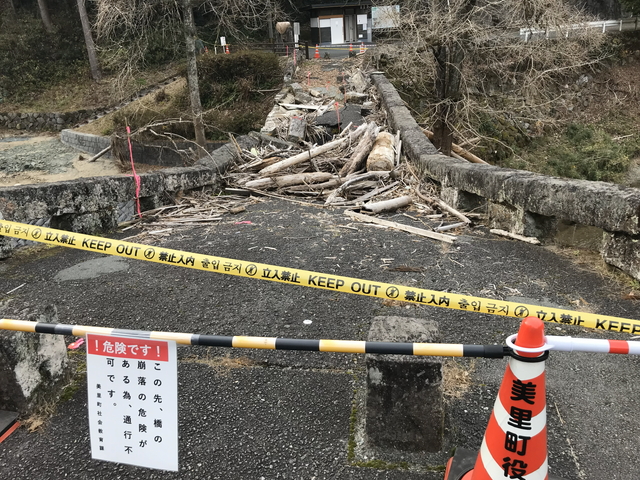 二俣橋は、文政05年(西暦1822年)頃に架橋されたと伝わります。 釈迦院川に架かる方が二俣渡(ふたまたわたし/上の写真)、津留川に架かる方が二俣福良渡(ふたまたふくらわたし)とそれぞれの名前もあります。 令和07年08月10日からの記録的大雨の影響で、大きく崩れています。そのため、崩落の危険から通行止めとなっていました。 |