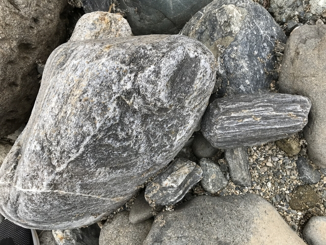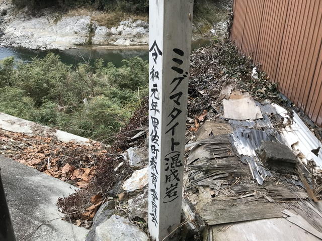 捜索中です。紐状の柄が出ていますが、これもミグマタイトなんだろうか。 日本の地質百選の中でも特に理解が難しいターゲットですが、私の理解で言えば、複数の岩石がぐちゃぐちゃに混ざり合っている岩石で、紐状の柄が出ています。 そんなミグマタイトは、熊本県上益城郡甲佐町周辺で見られ、緑川沿いに露頭が見られます。 |