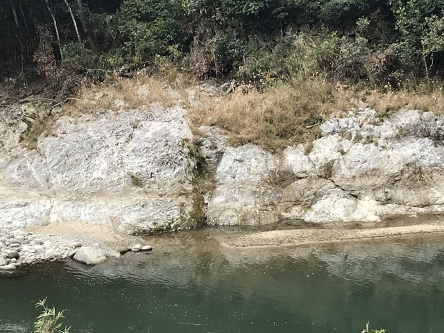 ここに標柱があるということは、対岸にあるのが、その露頭となります。確かに紐状の白い線が沢山入っていますね。 |