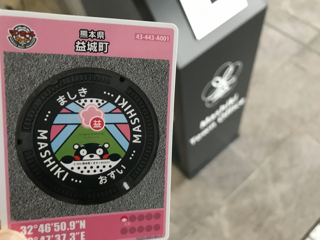 益城町役場に立ち寄って益城町Aのマンホールカードを頂きます。 くまモンとのコラボカードなので、人気が出そうなマンホールカードです。 |