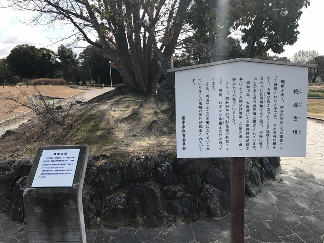 梅塚古墳(うめづかこふん)です。 現地の解説によると、もともと梅塚古墳は、古墳時代中期の前方後円墳だったそうですが、昭和34年(西暦1959年)の円形花壇を整備する際に、破壊されて一部の土塊が残っているだけです。 |