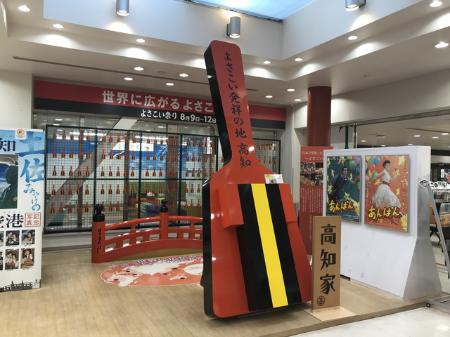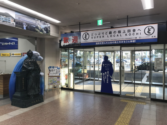 「どっぷりど級の極上田舎へ」「よさこい発祥の地 高知」「坂本龍馬像の横にカツオのたたきの広告」と高知県の一般的なイメージ通りのアピールがされています。 |