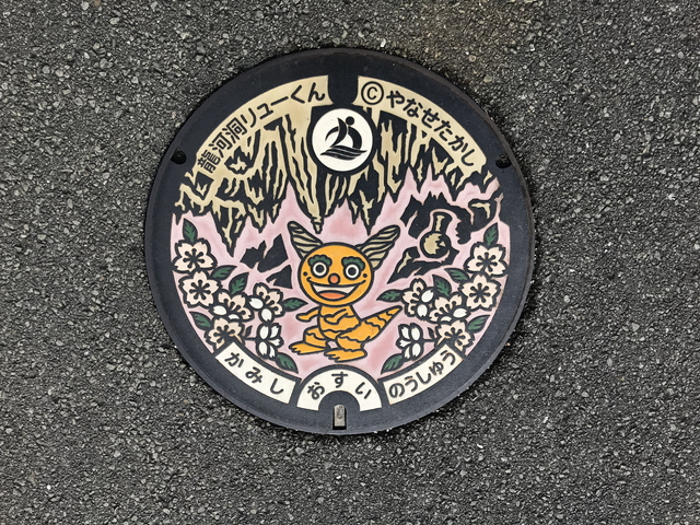 現地にあったご当地マンホールです。 香美市のイメージキャラクター13体のうち1体である龍河洞リューくん@やなせたかしさんです。 |