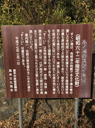 平成27年01月01日、令和07年12月31日他、何度か訪問しました。 すくい漁場は、長崎県諫早市高来町水の浦などに残る有明海の伝統漁業設備です。 すくい漁場は、潮の干満の差がきわめて大きい有明海ならではの漁法で、江戸時代から明治中期頃までは有明海沿岸や島原半島沿岸に200以上あったのだとか。 現地を訪問すると、かなり保存状態が良く、現在も利用されているようです。船で漁に出なくても魚が取れる、かつての画期的な漁法と言えます。 現地からは有明海の先に雲仙が見えます。 未来に残したい漁業漁村の歴史文化財産百選【すくい漁場】。日本の地質百選【有明海干潟】。 |