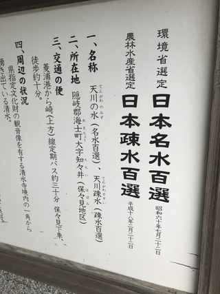平成23年09月18日、令和07年10月13日に訪問しました。 天川の水(てんがわのみず)は、島根県隠岐郡海士町(あまちょう)にある湧水です。 天川の水は、隠岐諸島・島前(どうぜん)の中ノ島にある湧水です。奈良時代に、行基がこの地を訪れた際に、この湧水を天川(天恵の水)と名付けたと伝承があります。近くに聖観世音菩薩を祀り、清水寺と名付けたそうな。 天川の水は、毎日400tの湧水があり、かつては簡易水道の水源として、現在は農業用水として利用されているみたいです。 本土から隠岐汽船のフェリーで約3時間ほど船に揺られて上陸です。本土から中ノ島への直通便がなく、島後か島前の他の島を経由しながらとなりますので旅の計画が難しい島です。 中ノ島・海士町は、レンタカーは島で唯一観光協会で借りることが出来ますが、キャッチフレーズ「ないものはない」と割り切ったスタンスで私は好きだけど、おもてなしに慣れすぎている人には向かなそうな島です。 昭和の名水百選【天川の水】。 |