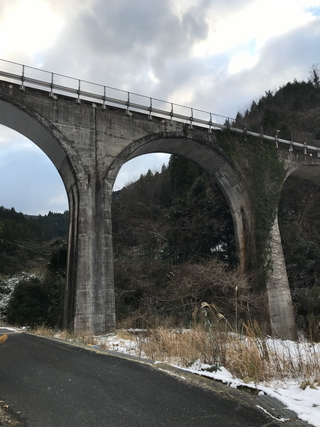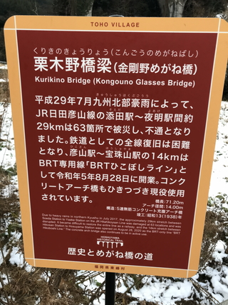 令和08年01月03日に訪問しました。 栗木野橋梁(くりきのきょうりょう)は、福岡県朝倉郡東峰村宝珠山に架かる5連のアーチ橋です。 栗木野橋梁は、昭和13年(西暦1938年)に完成したJR日田彦山線の筑前岩屋駅〜大行司駅の間にある鉄道橋です。通称として金剛野橋です。 ネット上には、昭和18年(西暦1943年)完成との情報もありましたが、大東亜戦争真っただ中に架橋するでしょうか。なので昭和13年完成が正しい記録と思います。 現地の案内板では、「栗木野橋梁(金剛野めがね橋)」として案内板が設置されています。 栗木野橋梁(金剛野めがね橋)の南側に、宝珠山橋梁(奈良尾めがね橋)、第二大行司橋梁(松尾めがね橋)と3つの眼鏡橋が続きます。 日本の橋100選【栗木野橋梁(金剛野橋)】。 |